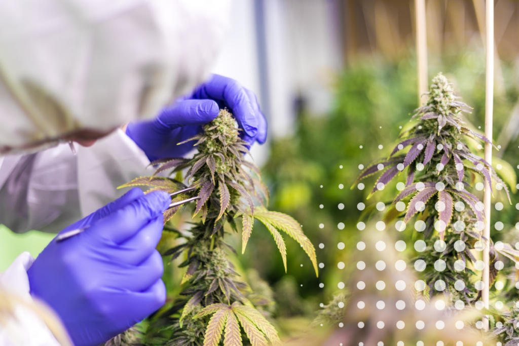 A scientist inspects a marijuana plant with a pair of tweezers while wearing protective equipment.